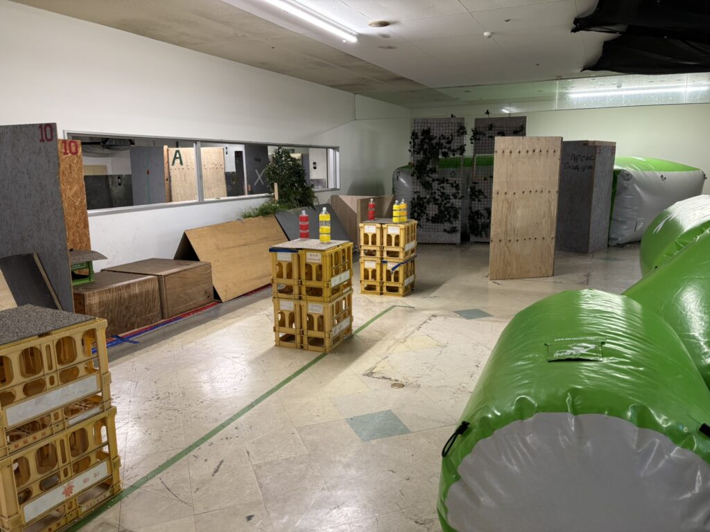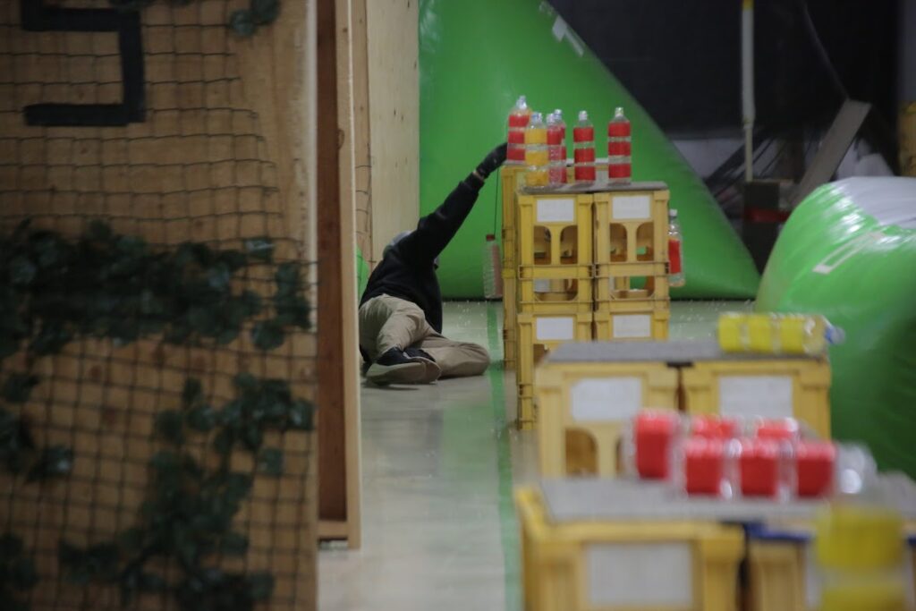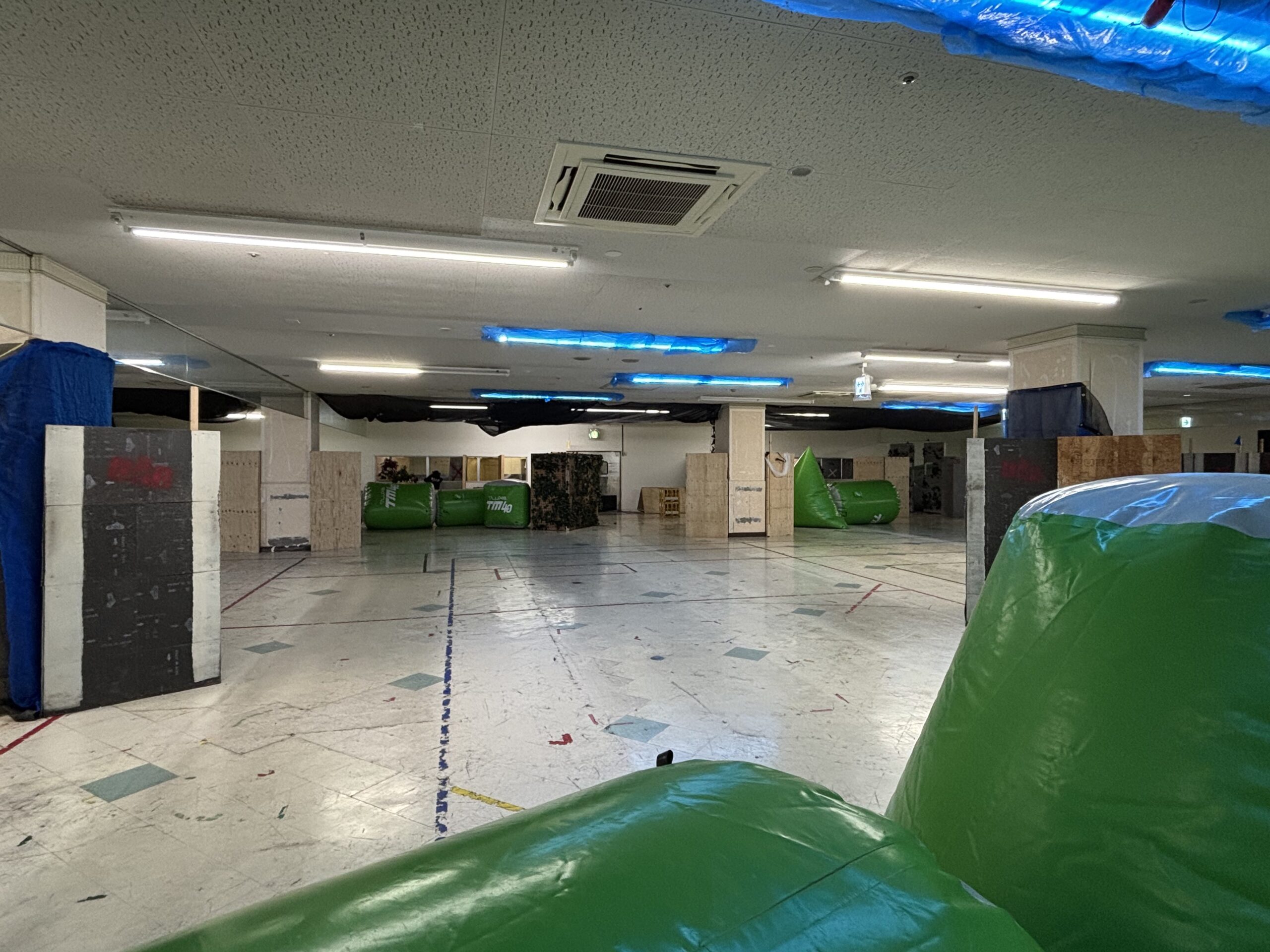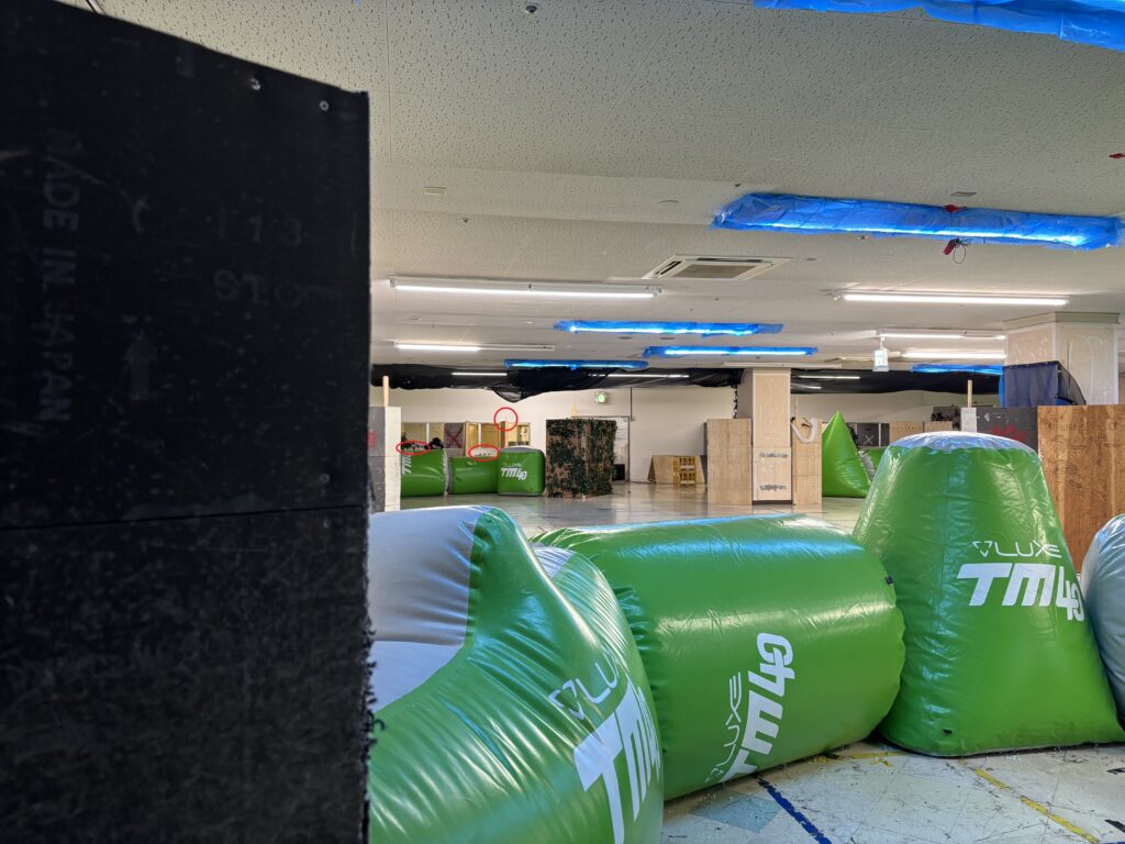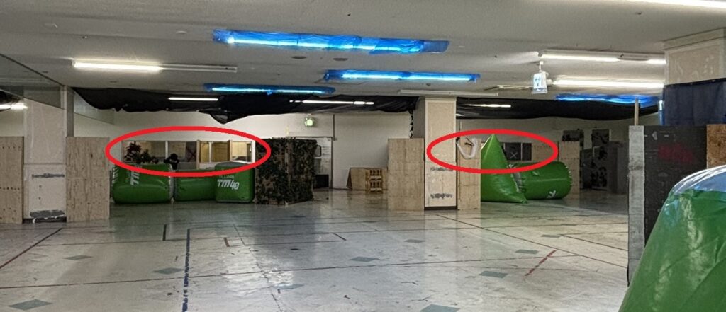 攻撃側の移動制限ラインは緑のバルーンのバリケの奥です。